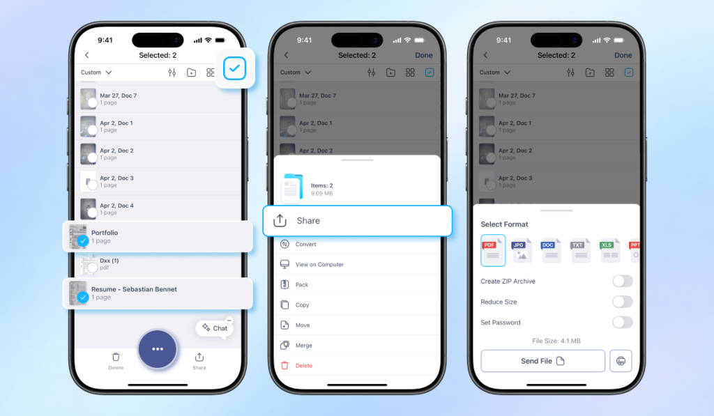 2. Tap three dots to the right of the file you want to share to open the dropdown menu. If you need to send multiple files, tap the Checkmark button in the top-right corner and select the documents that should be sent together.